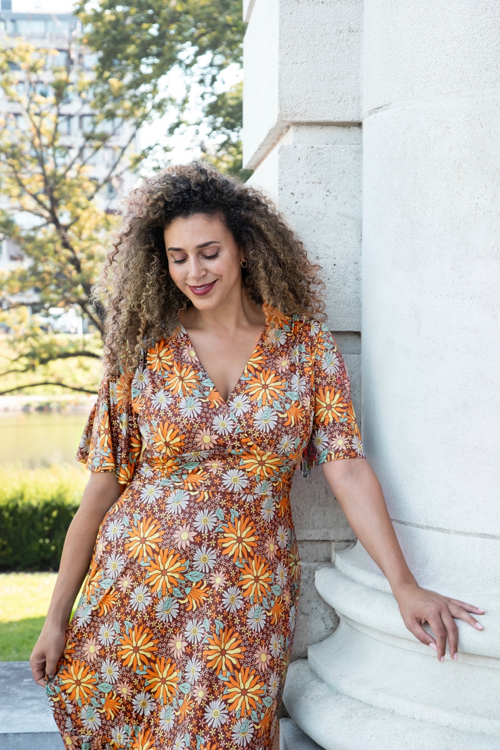 ”The boho life chose me!” Uitgevoerd in een glad en soepel, licht glanzend, stretchy, slinky stofje in bruin met een retro bloemenprint, dat garant staat voor veel kreukvrij draagplezier. * Korte vlindermouwtjes * Geplooide tailleband * Volledig gevoerd  * Geen rits of knopen; aantrekken en ready to go! * Reikt bij een lengte van 1,70 m tot aan de grond