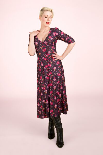 Bloei op in deze magisch mooie jurk! Een midi jurk met sierknoopjes, uitgevoerd in een soepele en stretchy auberginepaarse stof die bezaaid is met prachtige, kleurrijke bloemen.  * Midi jurk * V-halslijn  * 1/2 gerimpelde mouwtjes * Sierknoopjes * Geen rits of knopen; aantrekken en ready to go! * Reikt bij een lengte van 1,70 m tot halverwege de kuit