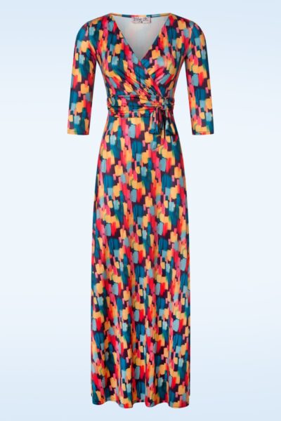 ”Always show your true colours!” Fresia heeft een prachtige aansluitende overslag top, 3/4 mouwen en een flatterende geplooide tailleband met een decoratief strikje. Vanaf de taille gaat ze over in een chique lange maxi rok. Ze is uitgevoerd in een glad en licht glanzend, soepel en stretchy, slinky stofje met een kleurrijke geometrische print. * Maxi jurk * Vaste overslag * Gevoerde top * 3/4 mouwen * Geplooide tailleband met vaste strikbandjes * Rok is gedeeltelijk gevoerd  * Geen rits of knopen; aantrekken en ready to go! * Reikt tot op de enkel bij een lengte van 1,70 m