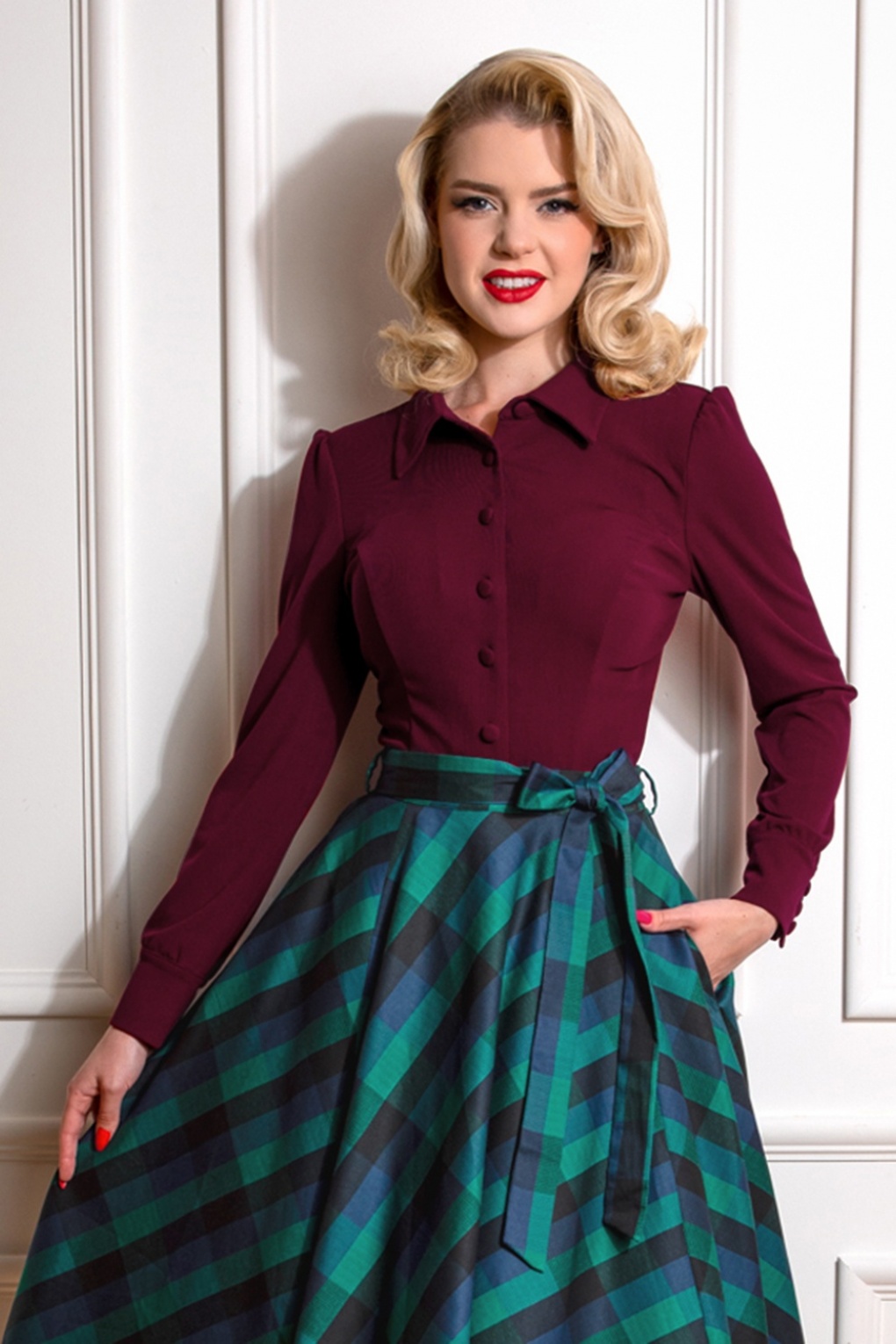 “Beautiful in burgundy!” Deze 50s Frida Blouse in Burgundy is de perfecte ”go-to” blouse voor het najaar! Frida is een getailleerd model met een klassiek puntig kraagje, knopenrij en lange pofmouwen met manchetten. Uitgevoerd in een stretchy en soepel, bordeauxrood stofje dat heerlijk draagt. Deze veelzijdige beauty moet je gewoon in je kast hebben hangen! 😉   * Getailleerd * Puntig kraagje * Knopenrij * Lange pofmouwen met manchetten * Lang genoeg om op een normale heupbroek te dragen