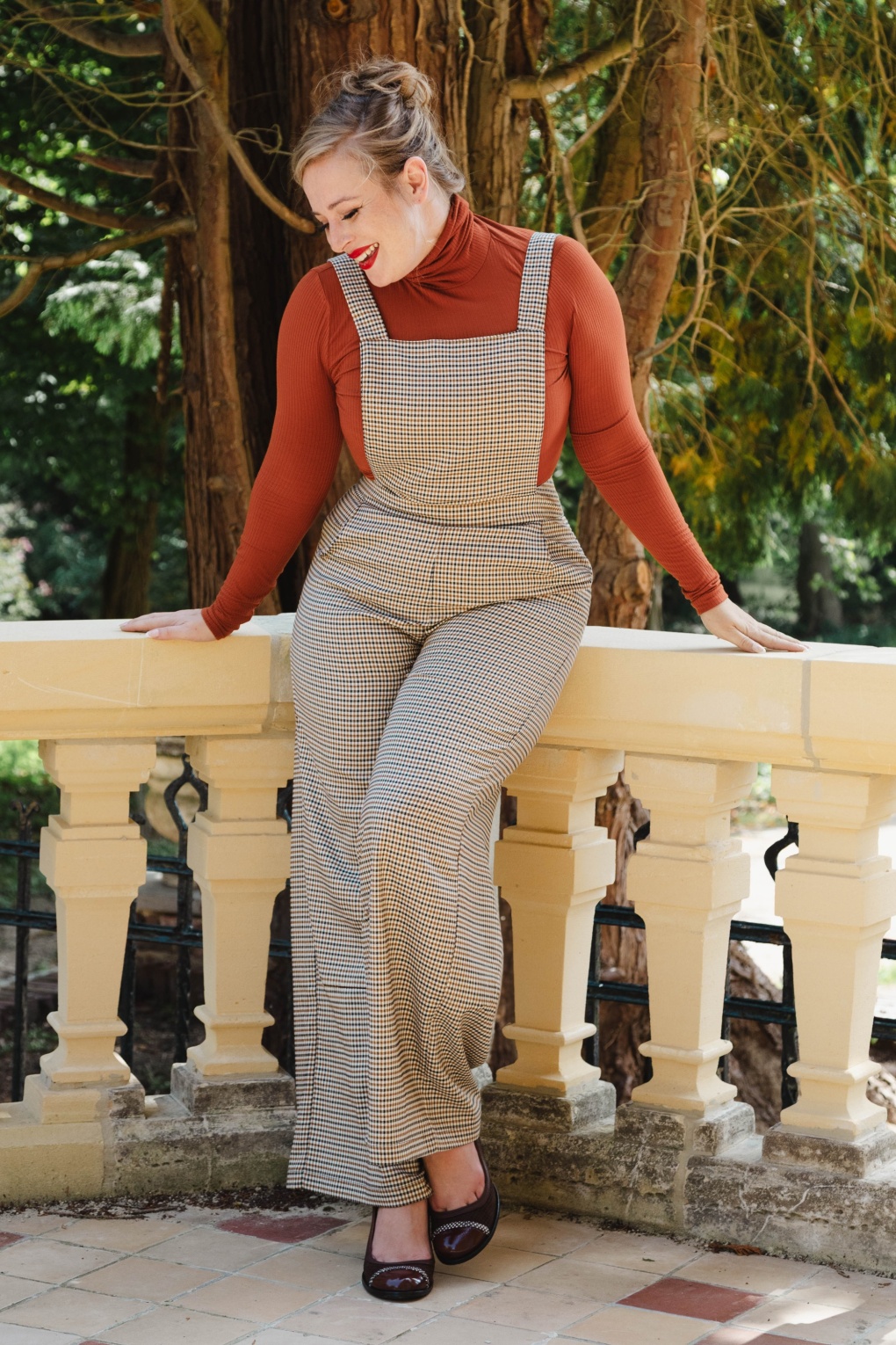 Deze Geek and Chic Dungarees in Tan is speels, stijlvol en comfortabel tegelijk! Aansluitend in de taille en op de heup vanwaar ze uitloopt in een wijde pijp zoals zo typerend is voor classy modellen uit de jaren 40. Uitgevoerd in een stevig maar soepel stofje (stretcht niet) en voorzien van een klassiek ruitjespatroon in crème, bruin en zwart. Deze tijdloze beauty is makkelijk te combineren en onmisbaar in je retro garderobe!   * Verstelbare schouderbanden * Wijde pijp * Zijwaartse steekzakken * Rits- en knoopsluiting achterzijde * Sam is 1,70 m