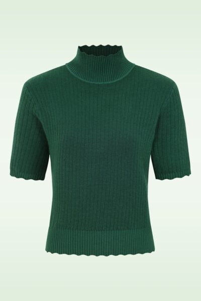 “Cozy meets chic!” Deze gebreide top heeft korte mouwen, een opstaand kraagje en een flatterende ribstructuur. De geschulpte ribboorden geven haar een extra speelse en vrouwelijke touch. Uitgevoerd in een soepele, stretchy stofmix met een vleugje viscose in een warme groentint.  * Opstaand kraagje * Afgeronde ribboorden  * Lang genoeg om op een normale heupbroek te dragen