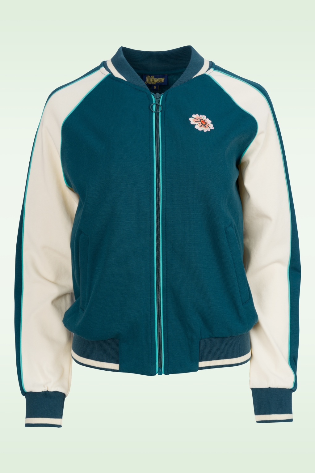 “Bomber cool, retro rule!” Deze speelse bomberjack is een echte blikvanger! Uitgevoerd in een soepele en stretchy, petrolblauwe bio katoenmix en is voorzien van prachtig bloemenborduursel. Dé perfecte mix van fun en retro flair!   * Bomber jack * Lange mouwen * Ritssluiting * Voorzien van zakken * Stretchy ribboorden * Lang genoeg om op een normale heupbroek te dragen