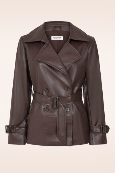 “Brown, bold, and effortlessly cool!” Dit korte jack van bruin imitatieleder is een absolute must-have voor jouw garderobe dit seizoen. Ze heeft een tijdloze uitstraling met een flatterende pasvorm, een grote reverskraag en sluit met stijlvolle knopen. Uitgevoerd in een licht glanzende, soepel vallende imitatielederen stof die heerlijk comfortabel draagt. * Imitatieleder * Geheel gevoerd  * Knoopsluiting  * Afneembare matching riem * It has pockets! * Lang genoeg om op een normale heupbroek te dragen