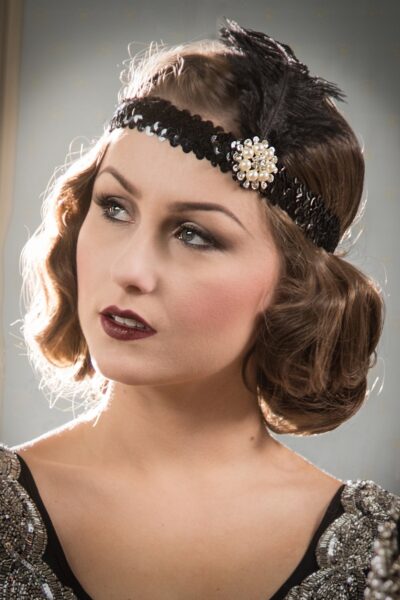 Een Gatsby style theme party? Deze prachtige elastische haarband is bezaaid met classy zwarte pailletten, shiny strass steentjes, een veer en elegante kunstparels.  * Stretchy * Strass * Kunstparels