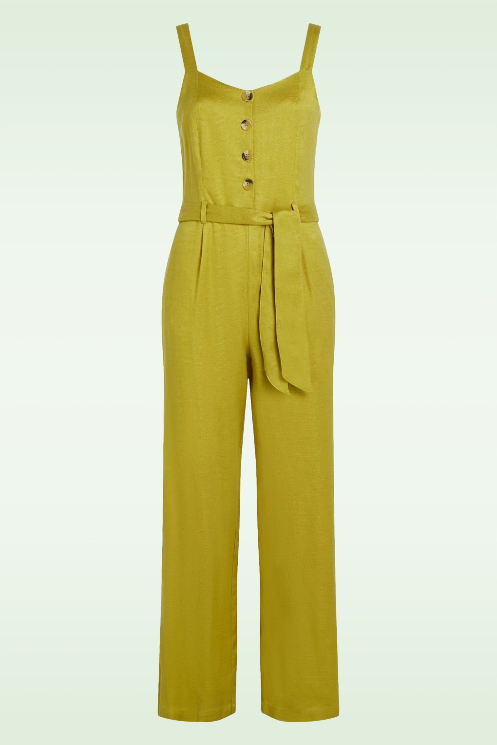 Slechts één blik op deze jumpsuit en je bent verkocht! Ines heeft een aansluitende top met grote knopen, een strikband in de taille en elegante lange wijde pijpen. Uitgevoerd in een zachte en soepele, groengele EcoVero viscose-/ linnenmix (stretcht niet) die heerlijk luchtig draagt.  * Bredere schouderbandjes * Knopenreeks * Afneembare strikband, voor een extra ‘snatched’ taille * It has pockets! * Blinde rits met haaksluiting achterzijde * Lange wijde pijpen