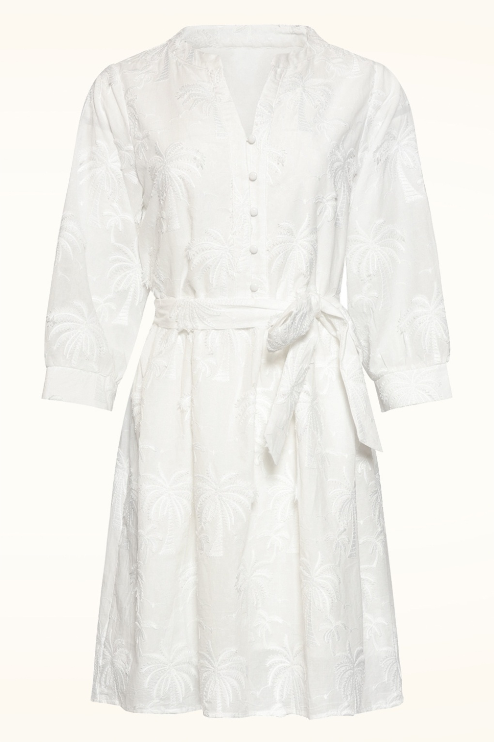 “Feeling palm-tastic today!” Deze witte a-lijn jurk is een frisse, zomerse must-have! Ze heeft een losse, comfortabele fit, 3/4 wijde pofmouwen en functionele knopen aan de voorzijde. De geborduurde palmbomen geven haar een speelse tropical twist en doordat ze is uitgevoerd in 100% katoen, draagt ze heerlijk luchtig en ademend.   * V-hals * Knopenreeks * Gevoerd * 3/4, wijde pofmouwen * Afneembaar striklint, voor een extra ‘snatched’ taille  * Valt bij een lengte van 1,70 m boven de knie