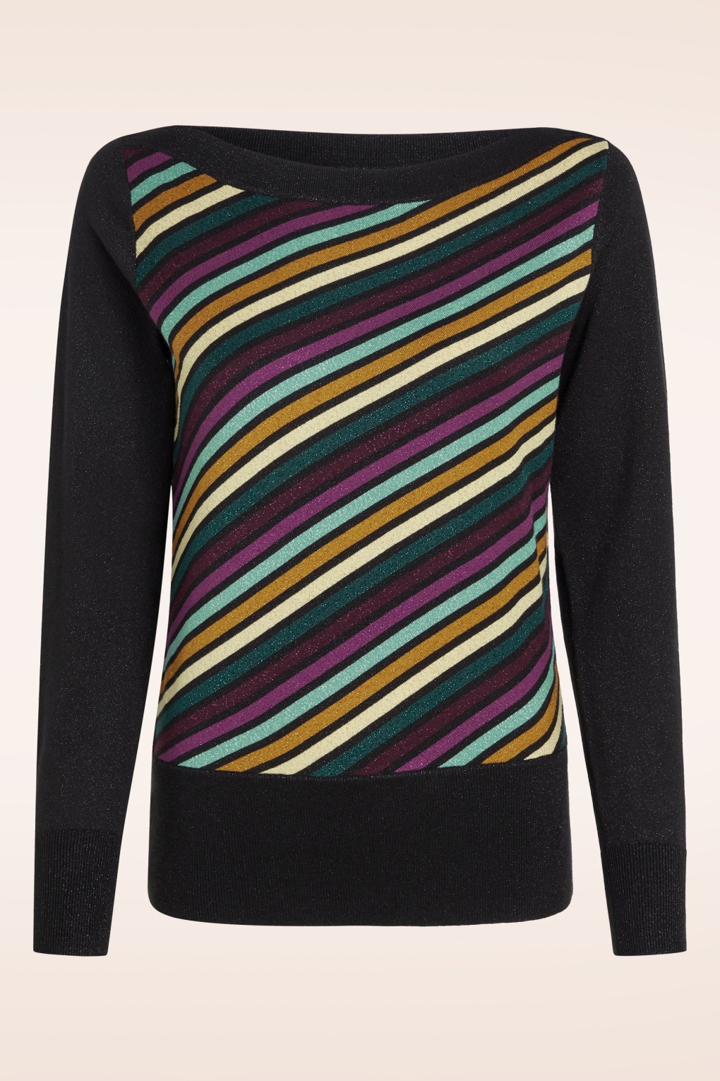 Deze Ivy Lapis top is de perfecte match met een retro rok of broek! Uitgevoerd in een soepele en stretchy, zwarte bio katoenmix voorzien van kleurrijke strepen en een ingewerkte glitterdraad. Zie jij alle fantastische combi’s al voor je? 😉   * Boothals * Lange mouwen * Stretchy ribboorden * Lang genoeg om op een normale heupbroek te dragen
