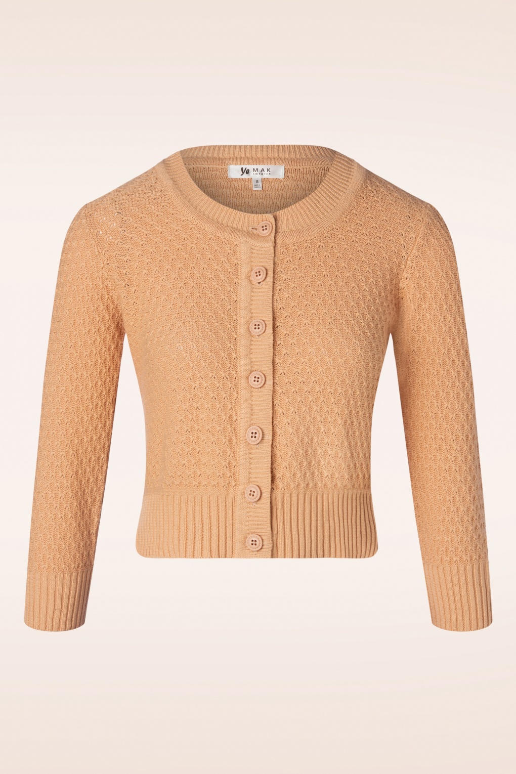 De combinatiemogelijkheden zijn eindeloos met deze 50s Jennie Cardigan in Tan… Online in Nederland, Duitsland en Frankrijk exclusief verkrijgbaar bij TopVintage! Vestjes zijn vaak ondergewaardeerde kledingstukken maar laten we daar eens verandering in brengen. Je draagt ze open of gesloten en zorgen ervoor dat je de rest van je garderobe ook tijdens koudere dagen kunt dragen, daar verdienen ze toch wel wat credits voor?! Deze veelzijdige topper heeft een klassieke snit met een ronde halslijn, 3/4 mouwen en stretchy ribboord voor een mooie pasvorm. Uitgevoerd in een dikkere maar heerlijke soepele en stretchy, fijngebreide katoen in een nude kleur met een subtiel patroon. Jennie verdient echt een plaatsje in jouw kledingkast, toch?   * Ronde halslijn * 3/4 mouwen * Stretchy ribboord * Iets korter waardoor perfect met high waist items