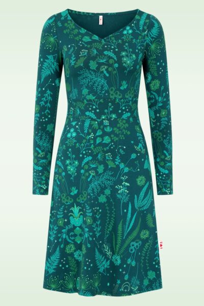 “A folklore fairytale in green!” Deze A-lijn jurk is uitgevoerd in een super comfortabele en stretchy, donkergroene (bio) katoenmix met een folklore-achtige print.   * A-lijn * Sierlijke halslijn * Geen rits of knopen; aantrekken en ready to go! * Valt bij een lengte van 1,70 m net op de knie