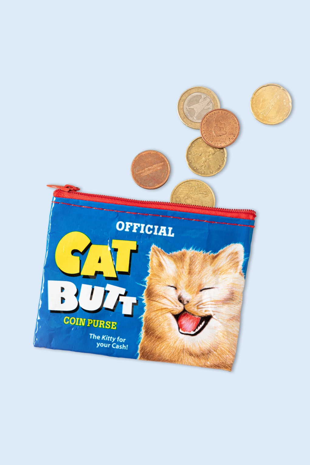 Je kleingeld veilig opbergen doe je in deze 50s Cat Butts Coin Purse! Iedere kattenliefhebber weet hoe het is om met de koninklijke derrière van Minoes de poes geconfronteerd te worden 😉 En laten ze dit beeld nou net gebruikt hebben als print op de achterkant van dit grappige portemonneetje. Gemaakt van (95%) gerecycled materiaal met een gerimpelde look in blauw, afgewerkt met een rode rits. ”We need this right meow!”   * Klein portemonneetje * Ritssluiting  * Ruimte voor voor wat kleingeld of enkele pasjes * Gerecycled materiaal (95%)  * 1% van de opbrengst wordt gedoneerd aan milieu organisaties over de hele wereld