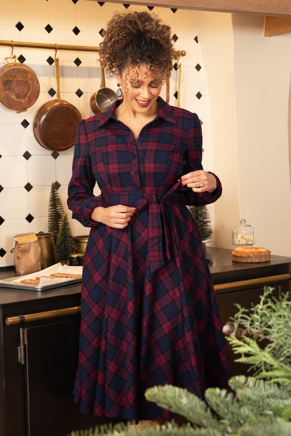 Kim Tartan swing jurk in marineblauw en bordeauxrood