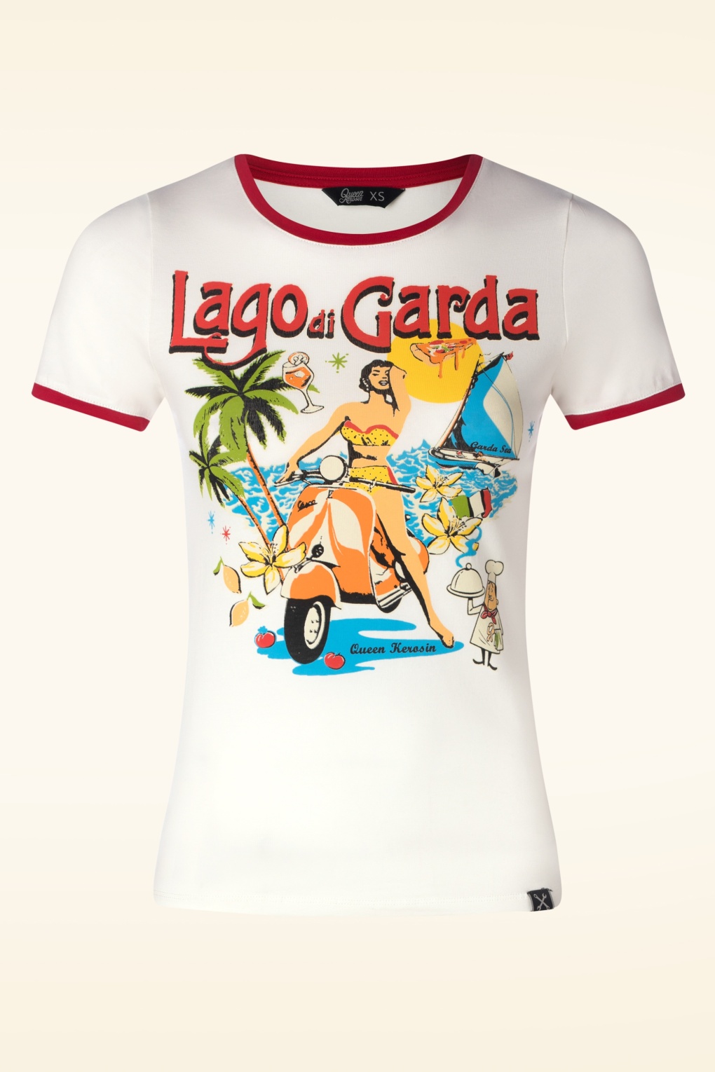 ”Lago di Garda, baby!” Dit shirtje heeft lipstickrode biezen en een TE leuke print. Daarnaast is ze uitgevoerd in een heerlijke stretchy katoenmix in gebroken wit die een genot is om te dragen.   * Lang genoeg om op een normale heupbroek te dragen