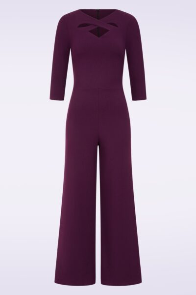 “Elegantly dark with just a flicker of the unusual; the perfect balance of seasonal and timeless.” Leah heeft een opvallende semi sweetheart halslijn met een gekruist detail, 3/4 mouwen en lange wijde pijpen. Ze is uitgevoerd in een stevige, maar soepel vallende en stretchy, crêpe achtige auberginepaarse stof, die heerlijk comfortabel draagt.    * 3/4 mouwen * Sweetheart halslijn met gekruist detail * Blinde rits achterzijde  * Lange, wijde pijpen