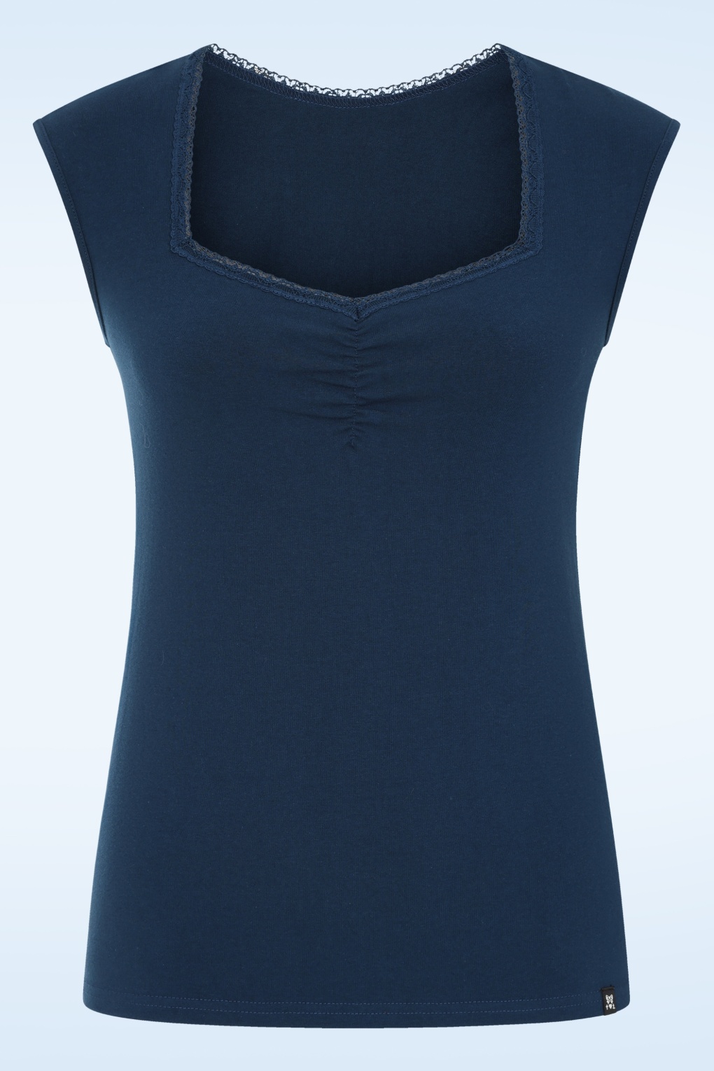 Zie jij alle fantastische combi’s met deze top al voor je?! De diamantvormige halslijn is afgewerkt met een kanten biesje en zorgt ervoor dat je een prachtig decolleté laat zien. Uitgevoerd in een stretchy, donker ultramarijn blauwe bio katoenmix voor een mooie aansluitende pasvorm. Waar je haar ook mee combineert, ze zal alle outfits omtoveren in een prachtplaatje!   * Kanten biesje * Lang genoeg om op een normale heupbroek te dragen
