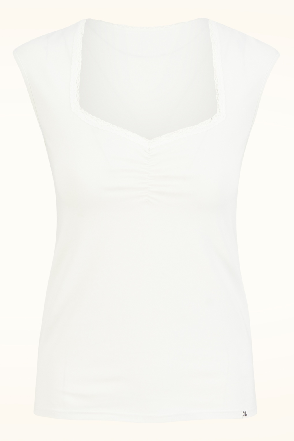 Zie jij alle fantastische combi’s met deze top al voor je?! De diamantvormige halslijn is afgewerkt met een kanten biesje en zorgt ervoor dat je een prachtig decolleté laat zien. Uitgevoerd in een stretchy, bio katoenmix in wit, voor een mooie aansluitende pasvorm. Waar je haar ook mee combineert, ze zal alle outfits omtoveren in een prachtplaatje!   * Kanten biesje * Lang genoeg om op een normale heupbroek te dragen
