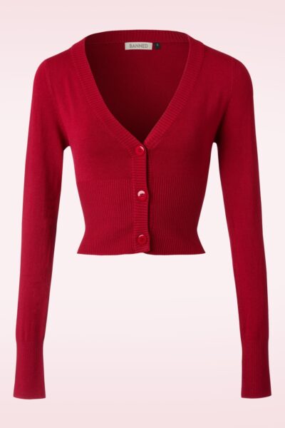 Dit vestje is classy in al haar eenvoud en daardoor DE perfecte match met al jouw vintage kledingstukken! Dit korte model heeft een elegante V-halslijn, lange mouwen en grote glimmende knopen. Uitgevoerd in een fijngebreide, dieprode stof met een heerlijke stretch voor een mooie aansluitende pasvorm. De combinatiemogelijkheden zijn eindeloos!   * Korter model * V-halslijn * Lange mouwen * Reeks knopen * Boordjes langs de halslijn, mouwen en onderkant