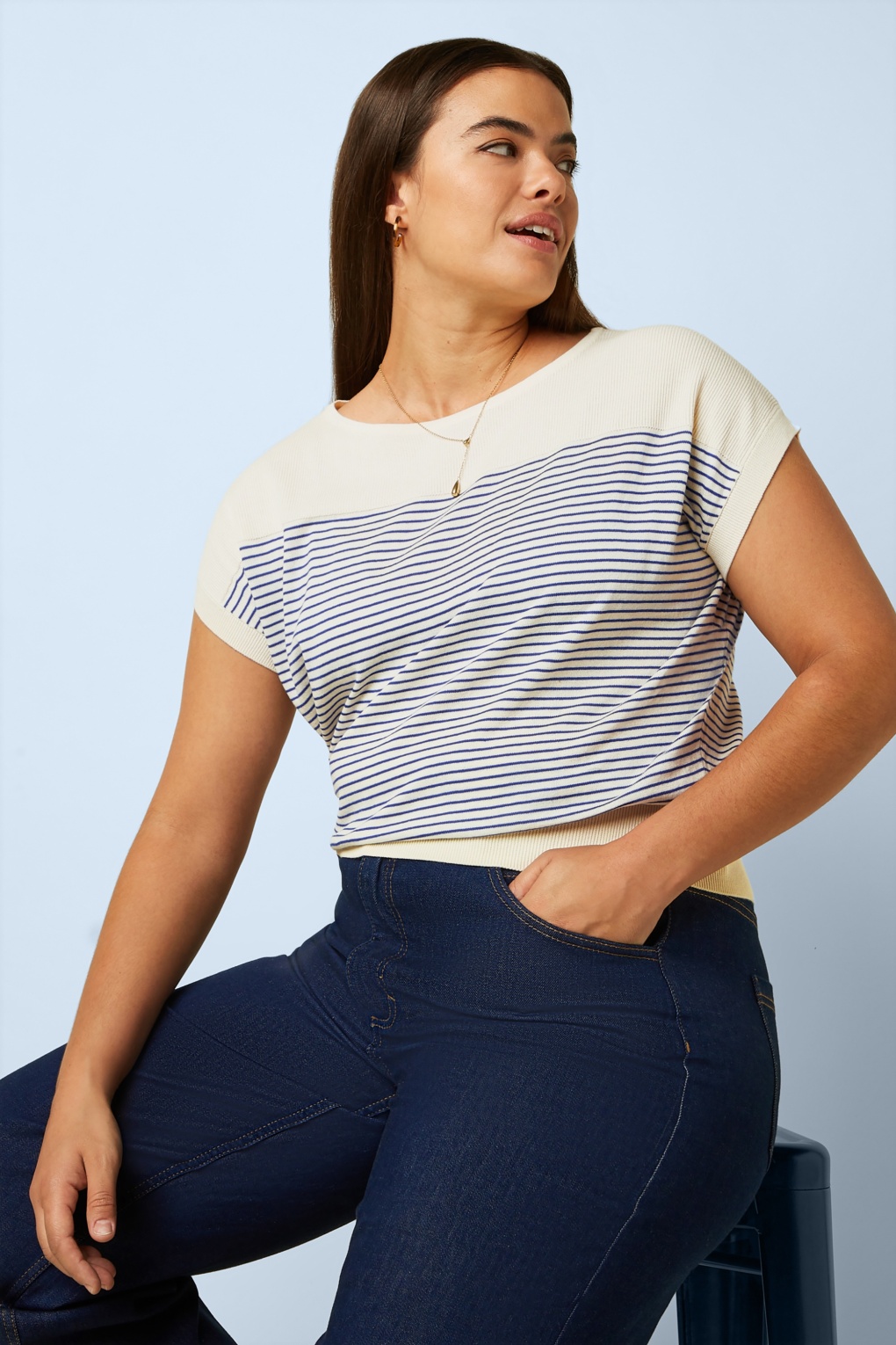 ”Cozy, cute, and totally you.” Deze knitted top is onmisbaar in je garderobe! Ze heeft een hoge halslijn, korte kapmouwtjes en is uitgevoerd in een soepele en stretchy katoenmix in crème met een verfijnd mazarineblauw streepje.  * Hoge halslijn * Kapmouwtjes * Stretchy ribboord * Lang genoeg om op een normale heupbroek te dragen