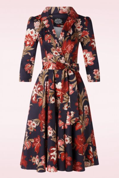 “Wearing this floral dress is like being hugged by a garden, minus the thorns!” 😉 Uitgevoerd in een soepele en stretchy, donkerblauwe katoenmix voorzien van bloemen- en bladeren die heerlijk draagt.   * ”Faux” overslag met revers kraag  * 3/4 mouwen * Afneembare riem, voor een extra ‘snatched’ taille * It has pockets! * Blinde ritssluiting in de zijnaad * Te combineren met een petticoat voor een extra feestelijk effect * Valt bij een lengte van 1,70 m over de knie