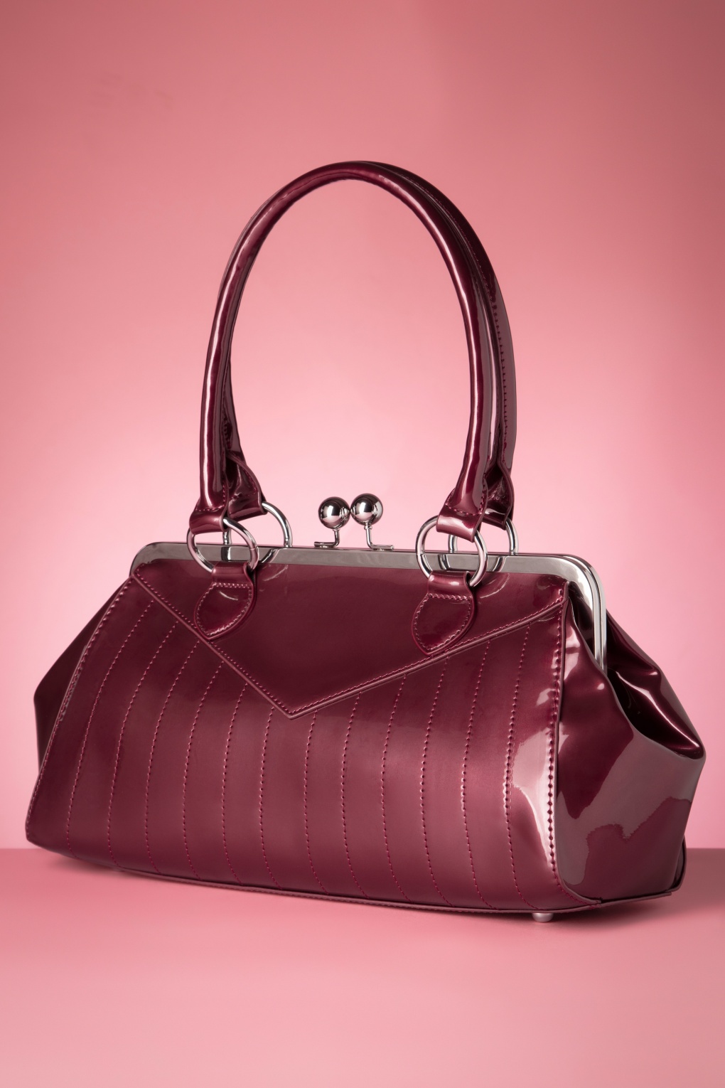 ”Table for 3. You, me and my bag!” Want deze handtas gaat voortaan altijd met je mee! Uitgevoerd in bordeauxrood imitatie lakleder met een zilverkleurige klipsluiting, korte hengsels en een los, verstelbaar hengsel.   * Zilverkleurige klipsluiting * Binnenvak met 3 extra vakjes, waarvan 1 met rits * Zilverkleurige details * Wordt geleverd met een los, verstelbaar hengsel * Kan crossbody gedragen worden * Rode voering met panterprint * Beschermpootjes onderzijde * Groot genoeg voor je telefoon, portemonnee, sleutels en een make-up tasje
