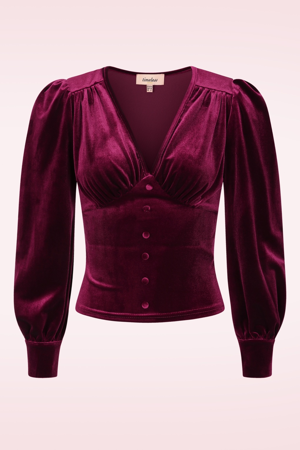 “Too glam to give a damn.” Deze prachtige top straalt pure elegantie uit met haar V-halslijn voorzien van subtiele plooitjes en sierknoopjes aan de voorzijde. De lange pofmouwen met manchetten zorgen voor een vleugje romantiek, terwijl de zachte stof met de look & feel van fluweel in een diepe bordeauxrode tint haar die luxueuze uitstraling geeft. * Plooitjes bij de buste * Sierknoopjes * Lange pofmouwen met manchetten * Geen sluiting!