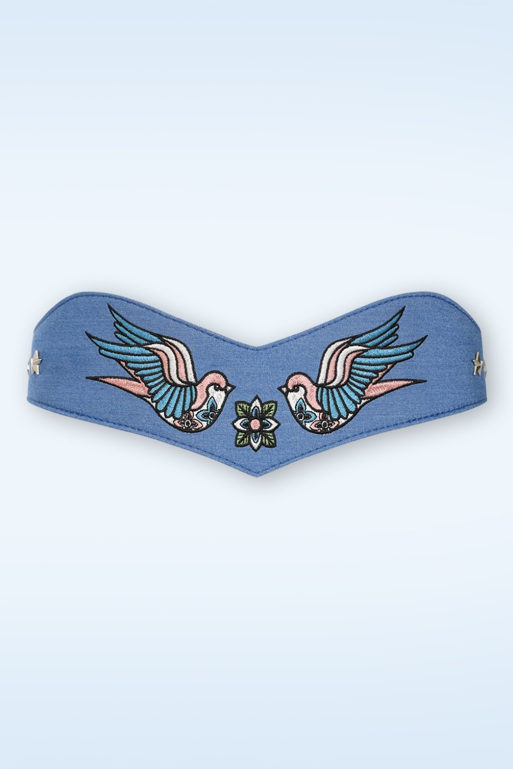 ”Rockabilly meets vintage denim charm!” Deze cutie is uitgevoerd in een licht denimblauwe katoenmix, voorzien van zilverkleurige details, borduursels van een bloem en 2 zwaluwen. Ze is uitermate comfortbel dankzij de elastische band en gemakkelijk te verstellen door middel van de drukknoopjes aan de achterzijde.    * Elastische band * Verstelbare drukknoopjes * Borduursels