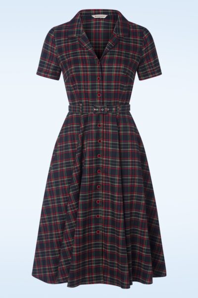 ”Merry everything and happy always!” Straal tijdens de feestdagen in deze Merry Holidays jurk! Ze heeft een elegante V-halslijn, reverskraagje, korte mouwen en loopt uit in een swing rok, die jou een prachtig vrouwelijk silhouet geeft! Uitgevoerd in een soepele en luchtige marineblauwe stof met een vleugje viscose (stretcht niet) en voorzien van gekleurde ruitjes.   * Swing model * V-halslijn * Reverskraagje * Korte mouwen met vaste omslagjes * Voorzien van goudkleurige knoopjes met rood fluweel  * Afneembare riem * Zijwaartse steekzakken * Valt bij een lengte van 1,70 m tot halverwege de kuit