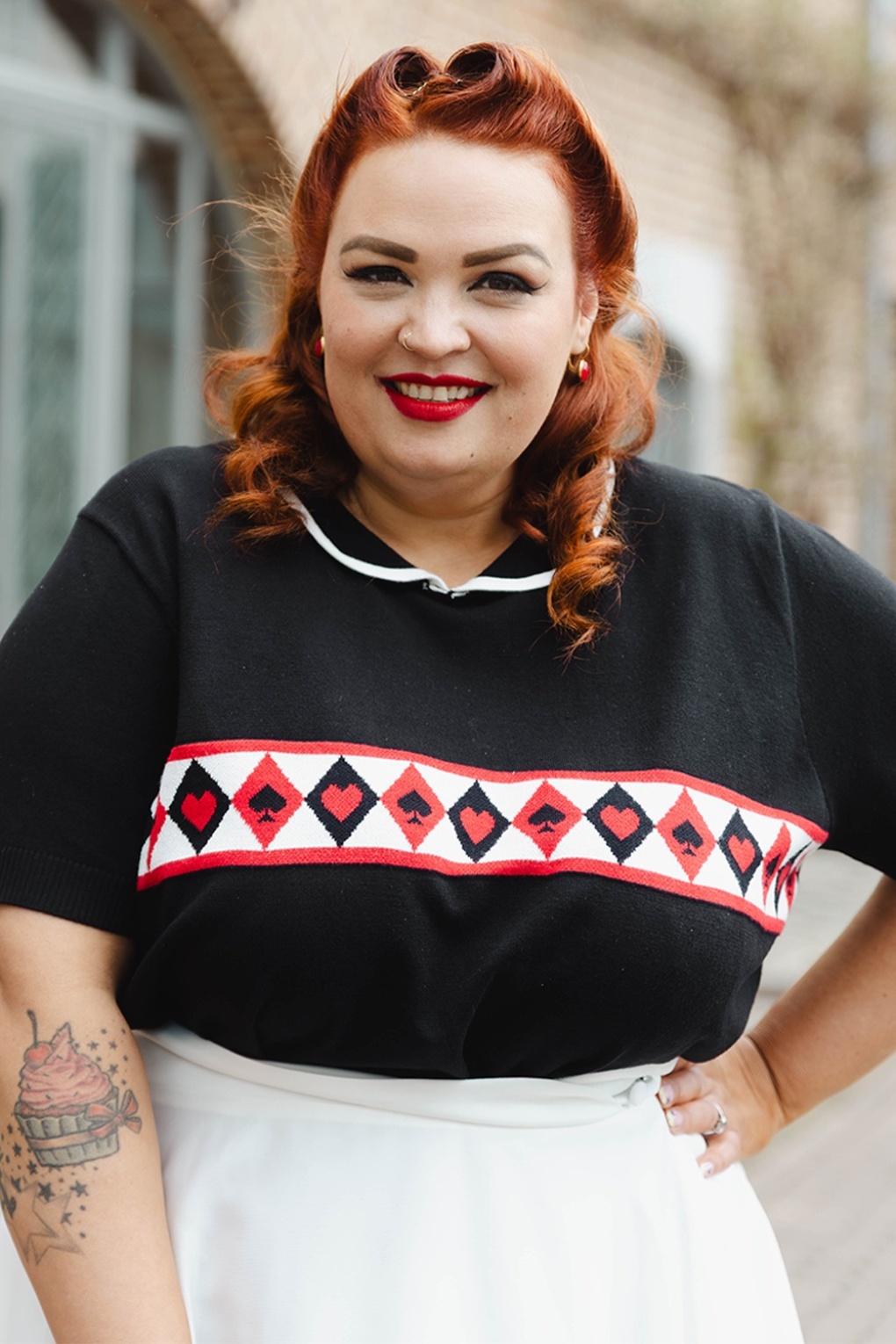 ”Deal me in!” Dit gebreide truitje heeft een schattig Peter Pan kraagje, korte mouwtjes en is uitgevoerd in een zachte, stretchy, zwarte viscosemix met een ‘spelkaarten’ print van schoppen en harten.   * Peter Pan kraagje * Korte mouwtjes * Stretchy ribboorden * Lang genoeg om op een mid-waist broek of rok te dragen