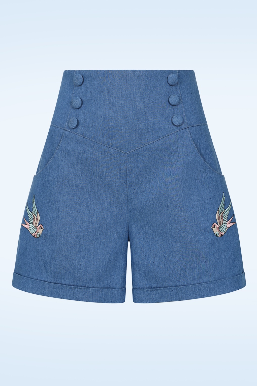 Geen zin in een jurk, maar te warm voor een broek? Hallo Millie! Ze wordt hoog in de taille gedragen en is voorzien van korte pijpjes met een speels omslagje; flatterend voor zowel dames met slanke benen als dames met curvy benen 😉 Uitgevoerd in een stevige, denimblauwe katoenmix met een fijne stretch, afgewerkt met sierknoopjes en geborduurde zwaluwen.   * Hoog taille model * Zijwaartse zakken * Sierknoopjes * Sierzakjes achterzijde * Aansluitende pijpjes met vaste omslagjes * Rits- en haaksluiting achterzijde