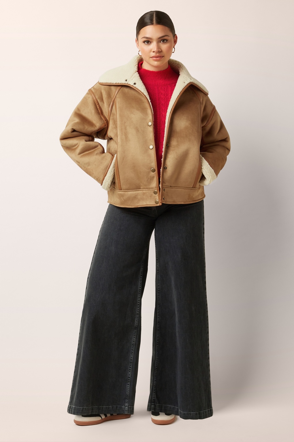 “Lammy love, winter ready!” Deze op de jaren ’80 geïnspireerde jas van imitatie-suède is ontworpen om je warm te houden tijdens de koudste winterdagen. Met haar kortere model geeft ze elke outfit een frisse retro touch. Uitgevoerd in een heerlijk zachte, dikkere gerecyclede imitatie-suède in een naturelbruine tint (zonder stretch), afgewerkt met typische imitatieleren stiksels en volledig gevoerd met heerlijk zacht lammy. * Korte ‘lammy’ jas * Loose-fit * Grote omslagkraag * Lange mouwen * Drukknopen * Voorzien van zakken * Volledig gevoerd * Let op; de kleur van het product op de video kan afwijken van de daadwerkelijke kleur van het product