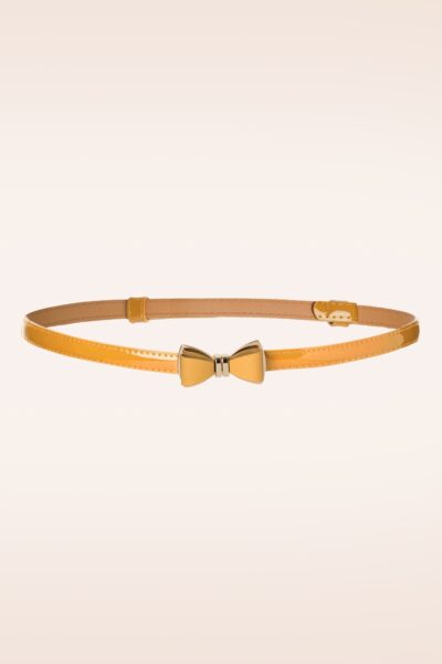 Deze smalle riem is een aanvulling op elke vintage outfit. Uitgevoerd in mosterdgeel imitatie lakleder met een elegant goudkleurig strikje, très chique! Subtiel riempje met een hoge wow-factor en een echte must-have voor alle vintage ladies!    * Sluit d.m.v. goudkleurige haaksluiting in de vorm van strikje  * Verstelbaar