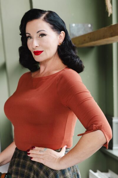 Deze 50s Oonagh Top in Brown is eenvoudig maar toch speciaal door de lieflijke details! De top heeft een mooie ‘slash’ halslijn en mouwtjes met splitjes die afgezet zijn met kleine strikjes, só cute! Uitgevoerd in heerlijk soepel en stretchy, cognacbruin katoen die zijn perfecte pasvorm zal blijven behouden, zelfs na een aantal wasbeurten. Een veelzijdige classy top die niet mag ontbreken in de kast van een echte vintage lady 😉   * ‘Slash’ halslijn * 3/4 mouwtjes * Vaste strikjes * Lang genoeg om op een normale heupbroek te dragen