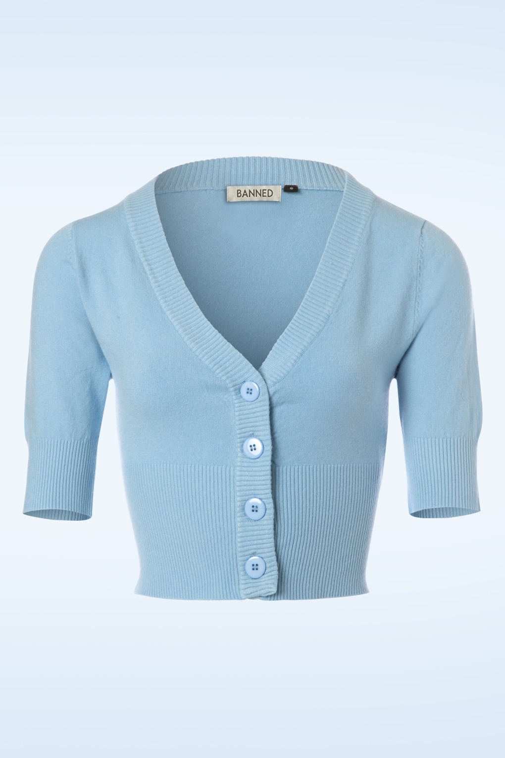 De 50s Overload Cardigan in Baby Blue is een echte klassieker! Classy in al haar eenvoud en daardoor DE perfecte match met al jouw vintage kledingstukken! Deze korte cardi heeft een elegante V-halslijn, 1/2 mouwen en grote glimmende knopen. Uitgevoerd in een fijngebreide, babyblauwe viscosemix met een heerlijke stretch voor een mooie aansluitende pasvorm. De combinatiemogelijkheden zijn eindeloos!   * V-halslijn * 1/2 mouwen * Reeks knopen * Stretchy ribboord langs de halslijn, mouwen en onderkant * Korter stijltje