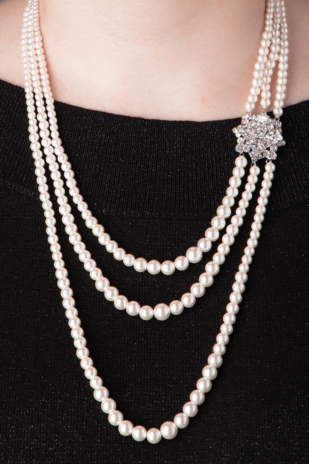 Zien we daar nu Coco Chanel lopen? Nee!? Audrey Hepburn dan? Of Jacky Kennedy? Ach, jij bent het met deze statement ketting om je nek! Een elegante, halflange parelketting met drie snoeren kunstparels in verschillende lengtes die vanuit de sluiting opbouwend groter worden. Maar de echte blikvanger is toch wel het bijna hypnotiserende ‘faux’ diamanten detail, gemaakt van zilverkleurig metaal en bezet met tientallen fonkelende strass steentjes en vier shiny facet geslepen steentjes… wow! * Kunstparels * Strass * Vintage geïnspireerde bakslot sluiting met prachtige details  * Hangertje met hartje aan de sluiting