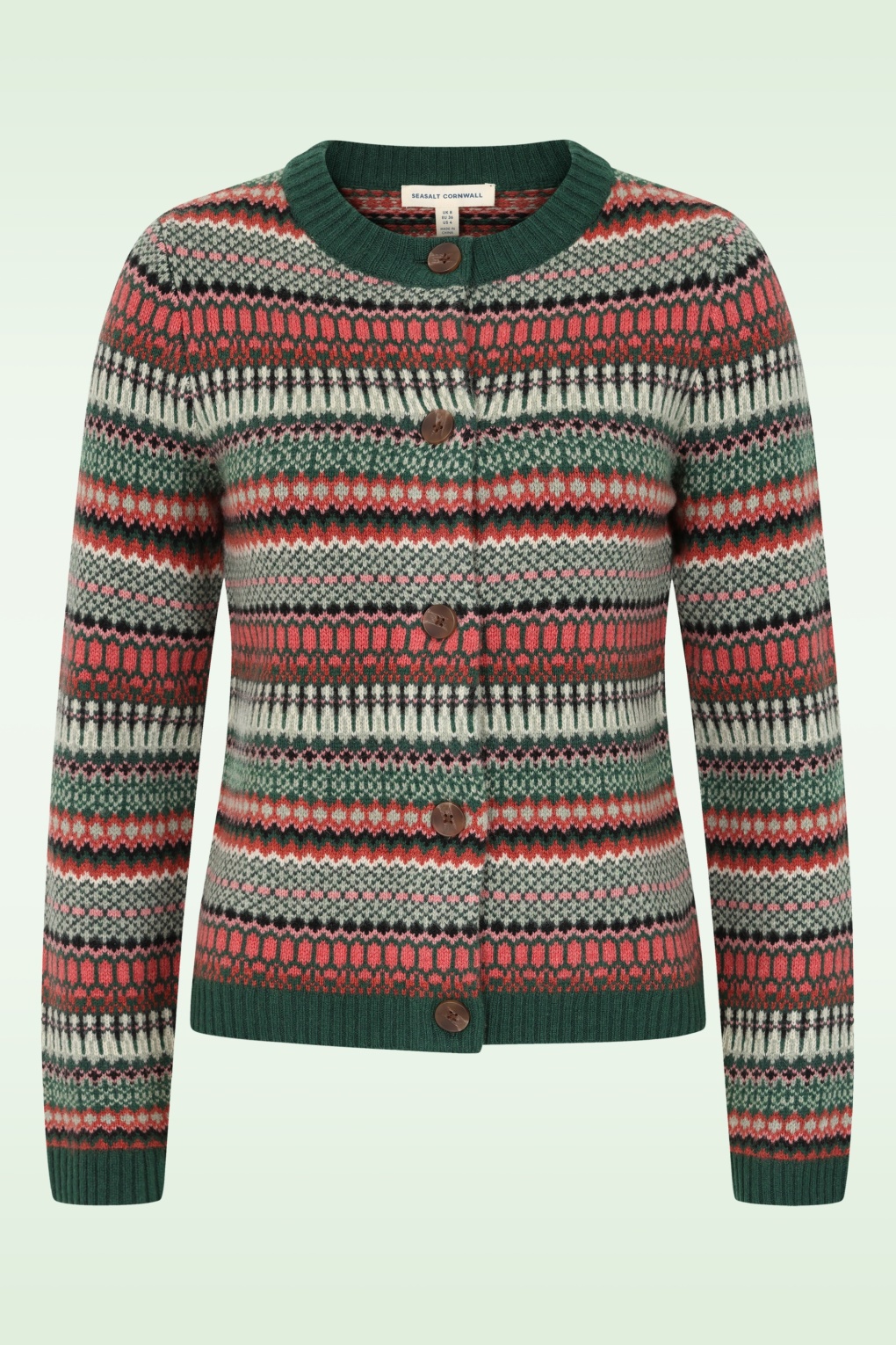 “Blushing pinks and forest greens intertwine in a cardigan that’s as kind to the planet as it is to your skin.” Deze cardigan met lange mouwen en knoopsluiting is uitgevoerd in een zacht gebreide, stretchy wolmix in groen en roze tinten met een ‘gestreept’ patroon.   * Lange mouwen * Ronde halslijn * Knopenreeks * Stretchy ribboord * Lang genoeg om op een mid-waist broek te dragen