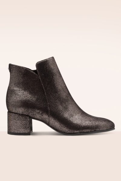 “Ankle armor, metallic attitude.” Deze booties met lage blokhak zijn uitgevoerd in tinkleurig vegan suèdine met een bruine ondertoon en een shiny (craquelé) overlay!    * Rond neusje * Lage blokhak * Rits aan binnenzijde * Comfy (touch-it) voetbed * Anti-slip zool en hak * Vegan approved!