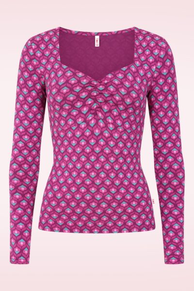 “A top as joyful as its name!” Ze heeft een sweetheart halslijn met plooitjes, lange mouwen en is uitgevoerd in een super comfortabele en stretchy, paars/roze bio katoenmix voorzien van een geweldige bloemetjesprint. * Sweetheart halslijn * Lange mouwen * Lang genoeg om op een normale heupbroek te dragen