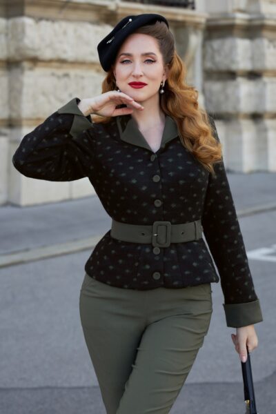 ”Blending classic style with luxurious comfort!” Say hello to Rachana Lou! Je nieuwe favoriete item uit de collectie ”Vintage Glam Icons” van Miss Candyfloss. De collectie is geïnspireerd op de glamoureuze eerste super modellen! Dit prachtige blazer jasje heeft een contrasterende kraag en contrasterende omslagjes aan de mouwen en is uitgevoerd in een warme en stevige, zwarte wolmix voorzien van een olijfgroene polka dot, bovendien is ze volledig gevoerd met een satijnachtig stofje. ”So classy!”   * Blazer  * Getailleerd model * V-halslijn * Volledig gevoerd voor extra comfort * Lange mouwen * Knopenreeks * Afneembare riem, voor een extra ‘snatched’ taille * Lang genoeg om op een normale heupbroek te dragen