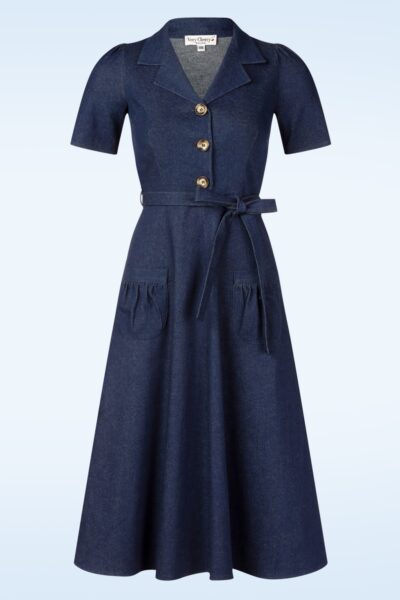 Voeg wat ‘fourties flair’ toe aan je garderobe met deze jurk! Ze heeft een V-halslijn met een speels revers kraagje, korte pofmouwen en een reeks grote knopen. Het striklint accentueert je taille voor een super vrouwelijk silhouet en de opgenaaide zakjes aan de voorzijde geven haar een speelse touch! Uitgevoerd in een stevige maar soepel vallende, donkere denim katoenmix met een fijne stretch, die heerlijk draagt.  * Semi-swing model * V-halslijn * Revers kraagje * Korte pofmouwen * Reeks knopen voorzijde * Afneembaar striklint, voor een extra ‘snatched’ taille * Zakjes voorzijde * Blinde rits aan de zijkant * Valt bij een lengte van 1,70 m halverwege de kuit