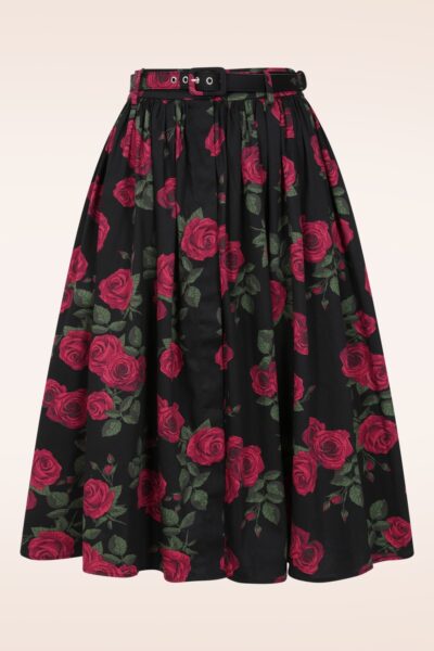 “A swing of roses, bold and unforgettable.” Deze swing rok met knopen wordt hoger in de taille gedragen waardoor er een super vrouwelijk silhouet ontstaat. Ze is uitgevoerd in een soepel vallende, 100% katoen in zwart (stretcht niet!) met een klassieke print van rode rozen. * Full swing rok * Zijwaartse steekzakjes * Knoop- en haaksluiting voorzijde * Riemlusjes * Afneembare matching riem  * Kan gecombineerd worden met een van onze petticoats * Valt bij een lengte van 1,70 m over de knie