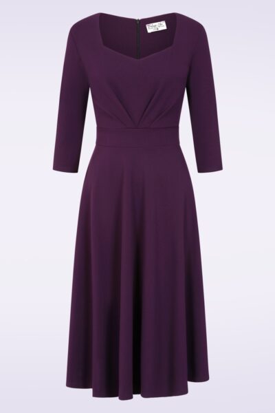 Vrouwelijk en flirty is deze Ruby swing jurk in aubergine! Wow, wat een schoonheid! Deze vintage geïnspireerde beauty heeft een elegante diamantvormige halslijn, een brede tailleband en flatterende plooitjes die sierlijk doorlopen naar de buste. De semi-swing rok in combinatie met de aansluitende top geeft jou een super vrouwelijk fifties silhouet. Uitgevoerd in een stevig, maar soepel en stretchy aubergine gekleurd stofje dat heerlijk draagt. Dit jurkje zal je hart veroveren, en niet alleen die van jou… 😉   * Semi-swing model * Diamantvormige halslijn * 3/4 mouwen * Blinde rits achterzijde * Valt bij een lengte van 1,70 m over de knie