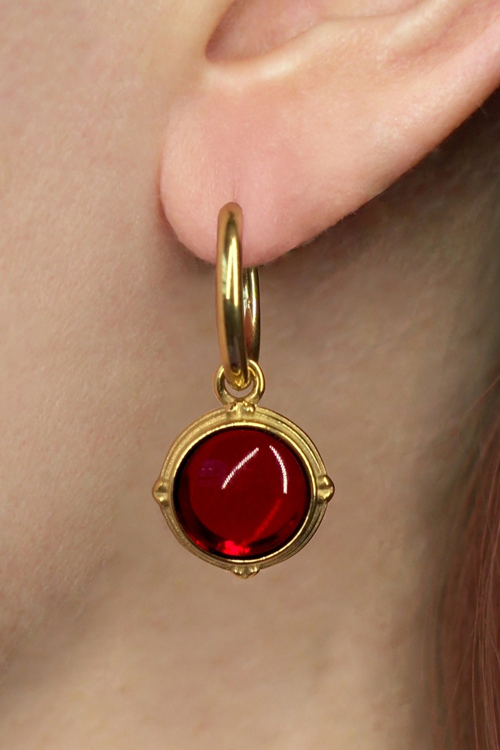 Cute and timeless! Deze oorbelletjes zijn uitgevoerd in verguld stainless steel met een hangertje voorzien van een robijnrode, bolle, glazen steen. * Ringetjes met kliksluiting * Glazen hanger * Verguld stainless steel * Verkleuren en vlekken niet * Nikkelvrij (anti-allergeen)