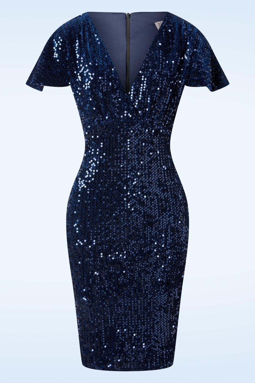 ”Dress up and dazzle!” Deze nauw aansluitende beauty is uitgevoerd in een prachtig fluweelachtig stofje bezet met glinsterende pailletten. De navyblauwe stof voelt heerlijk zacht aan en benadrukt je rondingen prachtig zonder af te tekenen.   * Aansluitend model * V-halslijn met vaste overslag  * Korte vlindermouwtjes * Volledig gevoerd * Ritssluiting achterzijde * Valt bij een lengte van 1,70 m over de knie