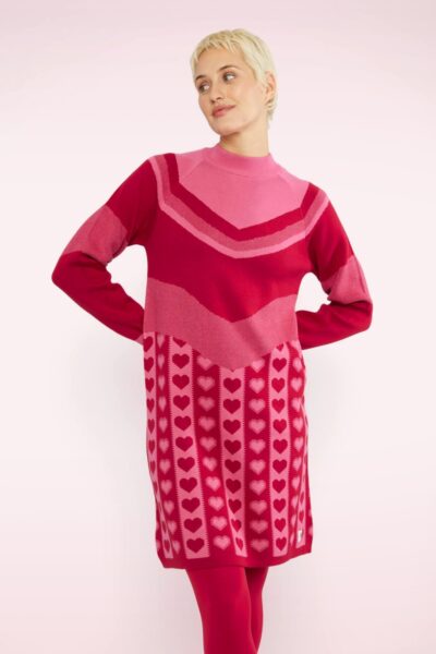 ”You won my heart!” Deze cozy jurk is uitgevoerd in een fijngebreide, zachte en stretchy, bio katoenmix voorzien van een rood en roze breipatroon met hartjes.   * Geen rits of knopen; aantrekken en ready to go! * Valt net boven de knie bij een lengte van 1,70 m