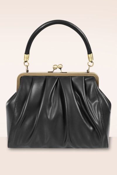 “Graceful pleats, timeless elegance.” Deze zwarte beauty heeft een opvallende goudkleurige metalen klipsluiting voor een echte vintage look. Uitgevoerd in geplooid zwart imitatieleder met een los, verstelbaar hengsel zodat je haar ook speels om je schouder kunt hangen.  * Medium sized * Klipsluiting * Binnenvak met 3 extra vakjes, waarvan 1 met rits * Afneembaar hengsel * Kan crossbody gedragen worden * Volledig gevoerd * Groot genoeg voor je telefoon, sleutels, en portemonnee