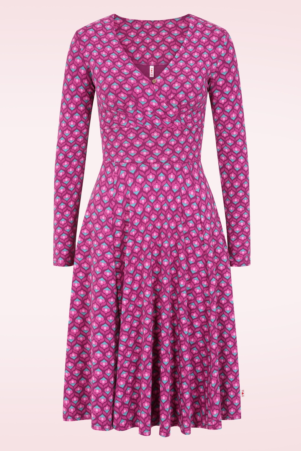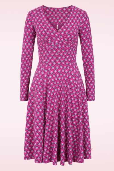 “A dress as joyful as its name!” Deze mooie jurk is uitgevoerd in een super comfortabele en stretchy, paars/roze bio katoenmix voorzien van een geweldige bloemetjesprint.   * Swing model * Vaste overslag met knoopsluiting * Geen rits of knopen; aantrekken en ready to go! * Valt net over de knie bij een lengte van 1,70 m