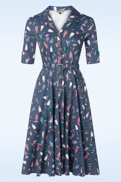 ”Walking in a winter wonderland!” Deze Ski Snow Season swing jurk heeft een elegante V-halslijn, reverskraagje, 3/4 mouwen en loopt uit in een prachtige swing rok, die jou een prachtig vrouwelijk silhouet geeft! Uitgevoerd in een stevige, maar soepele katoenmix (lichte stretch) voorzien van een schattige winterse print.  * Swing model * V-halslijn * Reverskraagje * 3/4 mouwtjes met splitjes * Reeks knopen * Afneembare riem * Zijwaartse steekzakken * Valt bij een lengte van 1,70 m tot halverwege de kuit