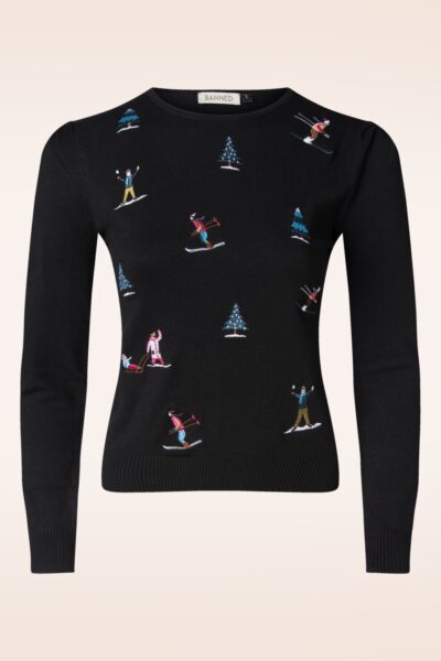 ”Winter adventures await!’ Deze cutie heeft een mooie ronde halslijn, lange pofmouwen en winterse borduursels aan de voorzijde. Ze is uitgevoerd in een heerlijk zachte, fijngebreide, zwarte viscosemix.    * Ronde halslijn * Lange pofmouwen  * Stretchy ribboorden * Lang genoeg om op een normale heupbroek te dragen
