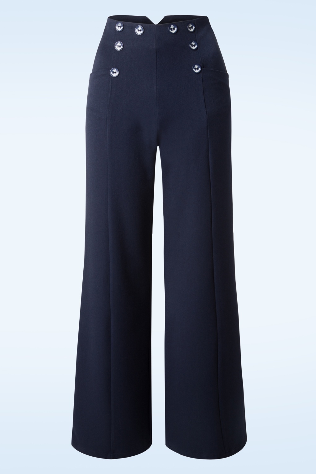 Geïnspireerd op de pantalons die de vooruitstrevende dames in de jaren 40-50 droegen! De vrouwelijke hoge taille vormt een mooi contrast met de wijde pijp en heeft een super afkledend effect, ook als je vollere heupen/billen hebt. De ”faux” anker knoopjes geven het geheel een sailor touch en maken het helemaal af. Uitgevoerd in een soepel vallend, licht stretchy stofje in een donkerblauwe kleur voor een heerlijke pasvorm. We like sailors but LOVE the sailor style!   * Wijde pijpen * ”Faux” knopen voor- en achterzijde * Zijwaartse steekzakjes * Blinde rits en haaksluiting zijkant * Gemakkelijk in te korten * Vanessa Frankenstein is 1,67 m