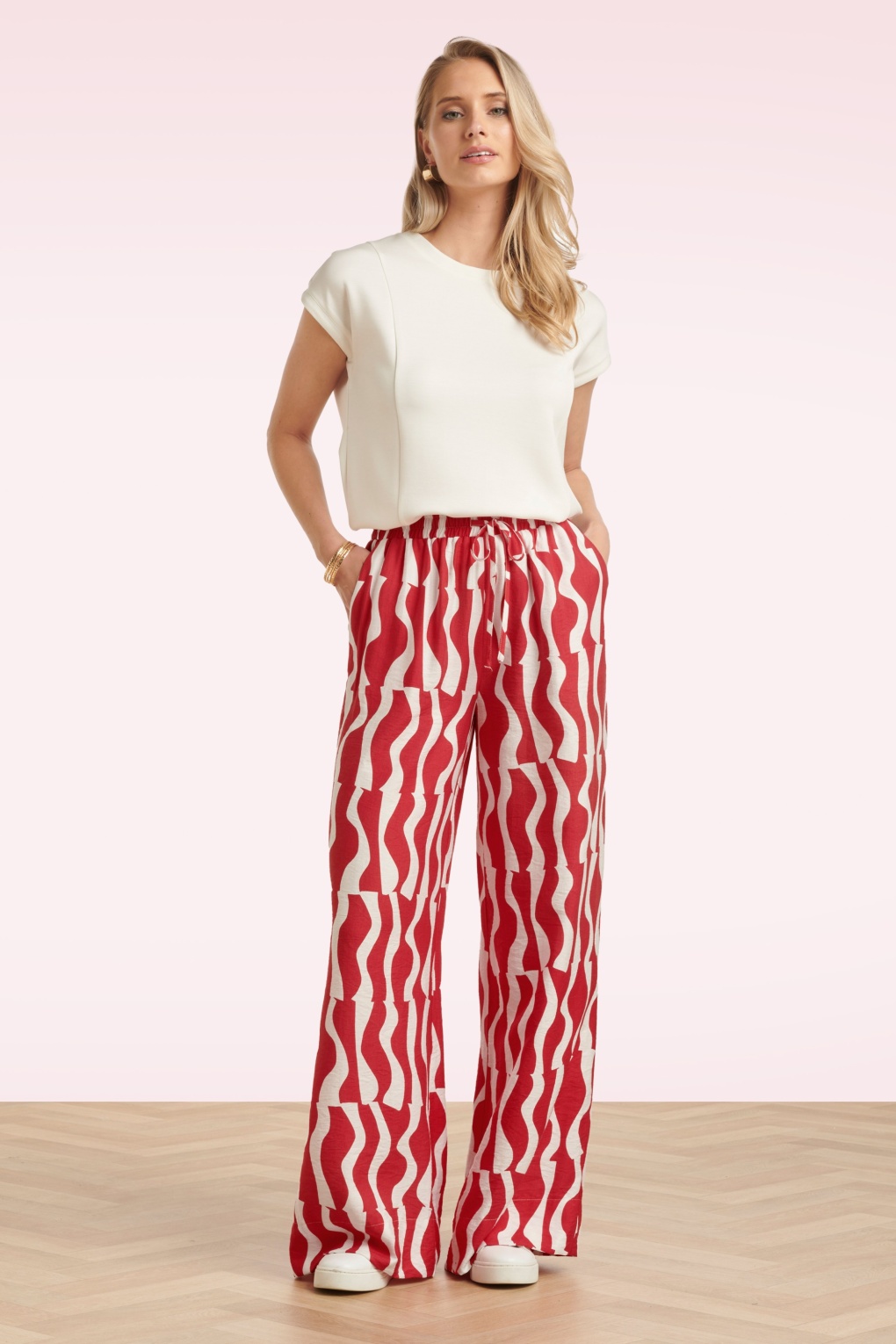 “A little spice for sunny days.” Deze wijde pantalon draagt ontzettend comfortabel dankzij de verstelbare elastische tailleband en is uitgevoerd in een luchtige en soepele linnen-look stofmix (stretcht niet)  met een grafische print in rood en wit. * Elastische tailleband met koord * It has pockets! * Lange, wijde pijpen